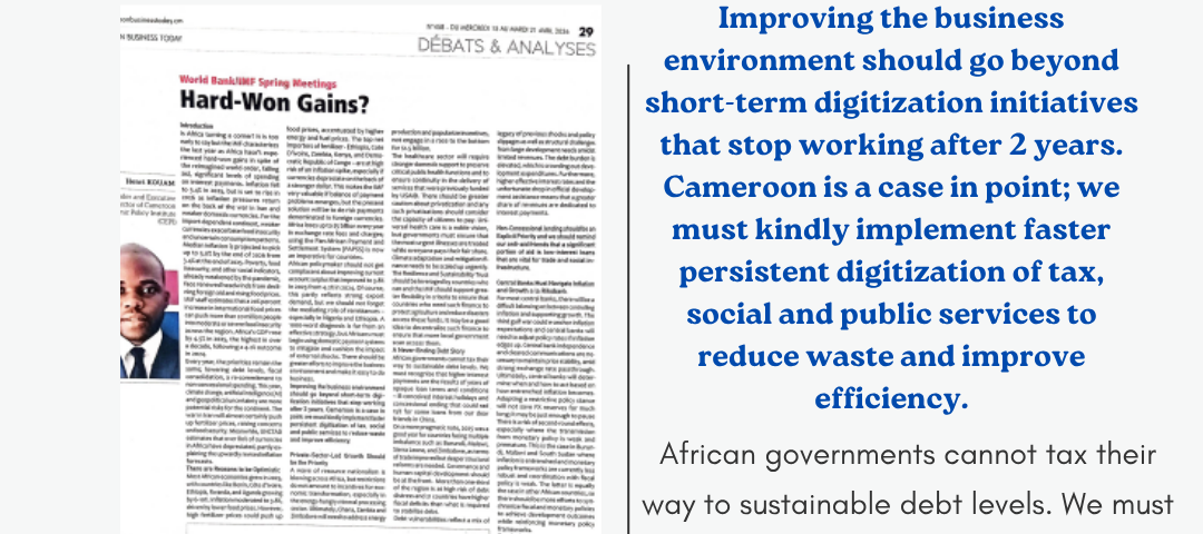 Improving the business environment should go beyond short-term digitization initiatives that stop working after 2 years. Cameroon is a case in point; we must kindly implement faster, persistent digitization of tax, social, and public services to reduce waste and improve efficiency.